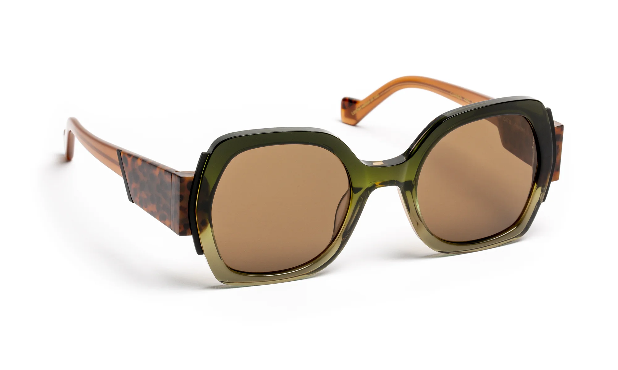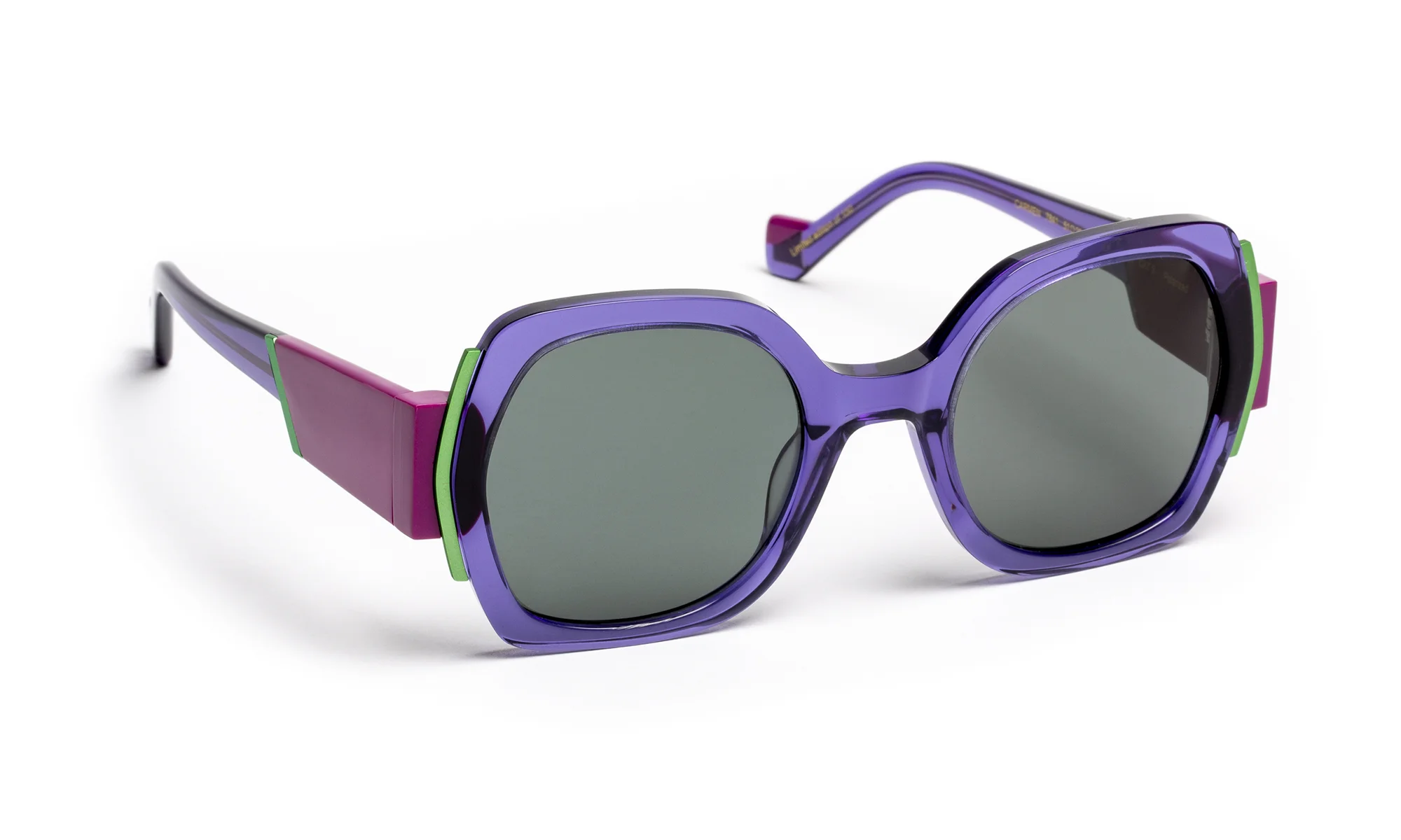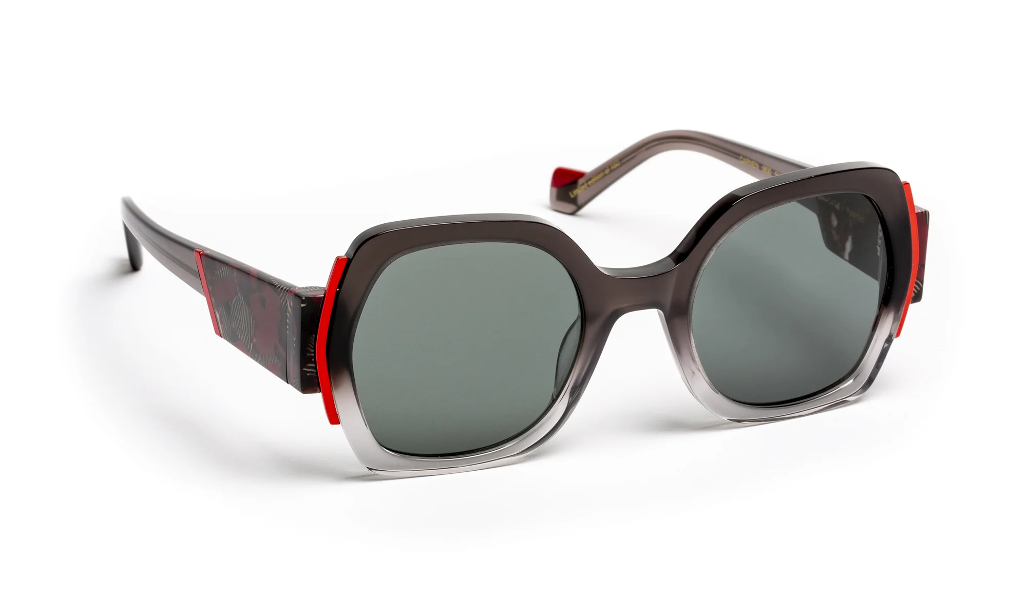 Monture solaire en acétate au design sophistiqué, sublimée par une finition facettée entièrement travaillée à la main. Ses larges branches, délicatement creusées, captent la lumière et révèlent des reflets subtils pour une allure contemporaine et affirmée. La palette de coloris en dégradé translucide joue sur la transparence et la profondeur, créant des effets de lumière changeants qui illuminent la face.