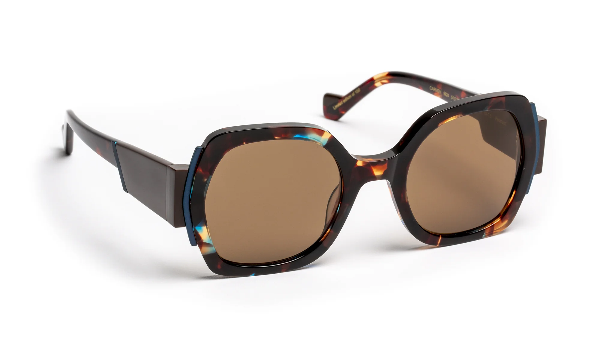 Graphique et audacieux, ce modèle joue avec la couleur et la lumière grâce à une construction multicouche. La face en acétate, soulignée d’une lamination contrastée et d’un insert métallique, capte les reflets et affirme la structure.