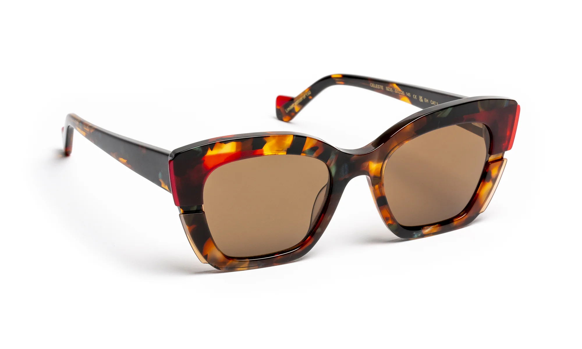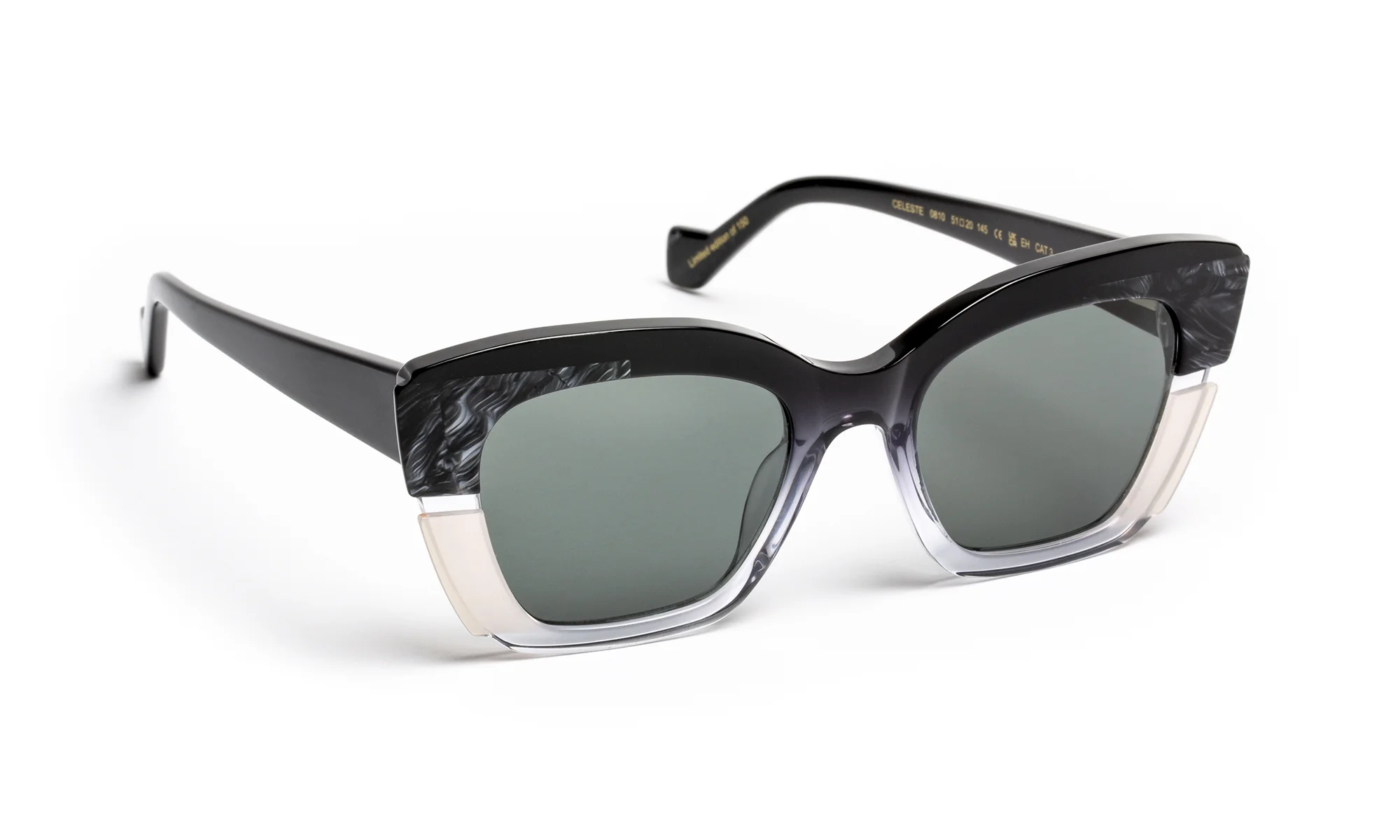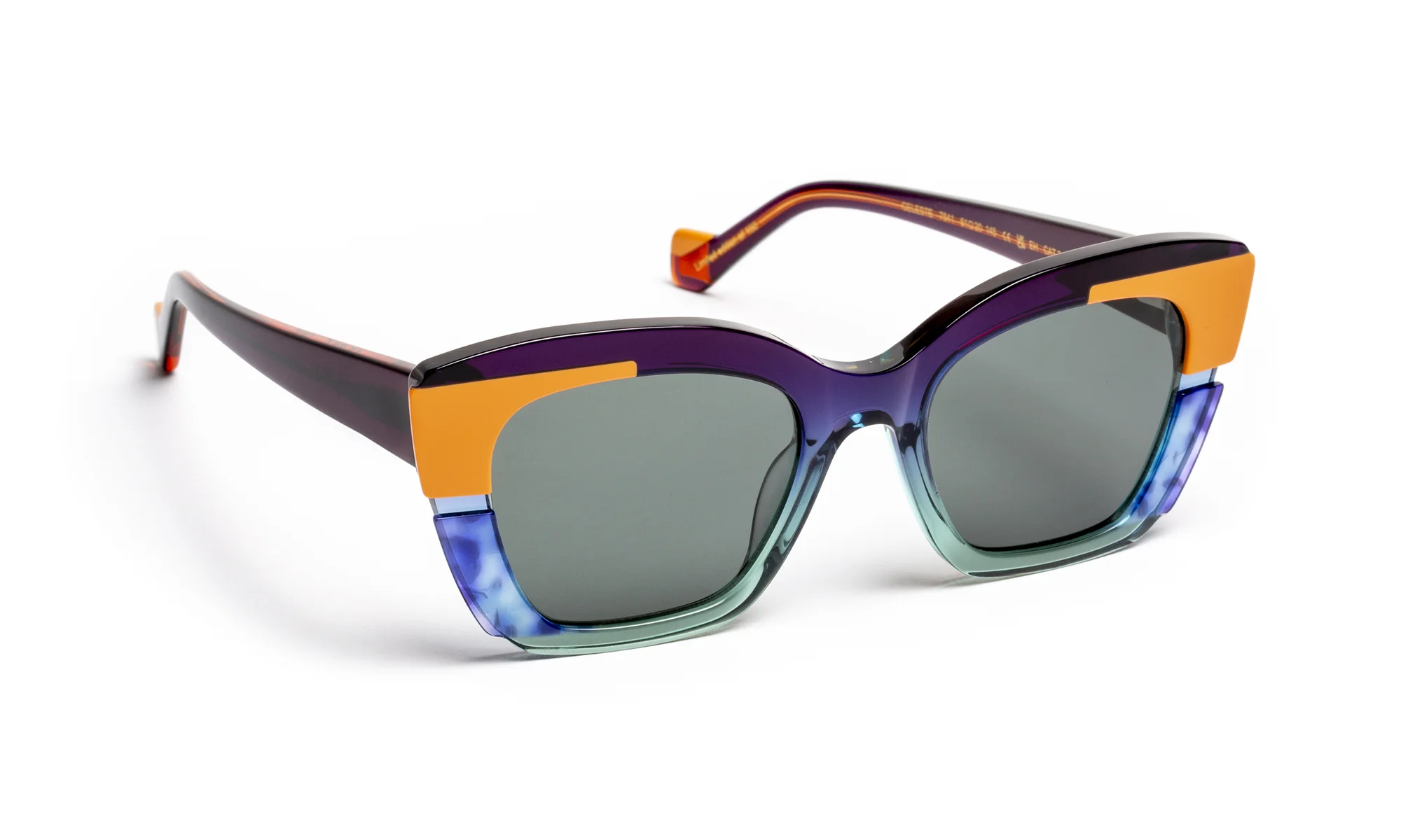 Conçu pour sublimer la lumière, ce modèle explore la transparence et la couleur à travers un travail minutieux de l’acétate. La face, enrichie de deux laminations latérales, compose un subtil jeu de superpositions où le fraisage horizontal capte et diffuse la lumière avec élégance.