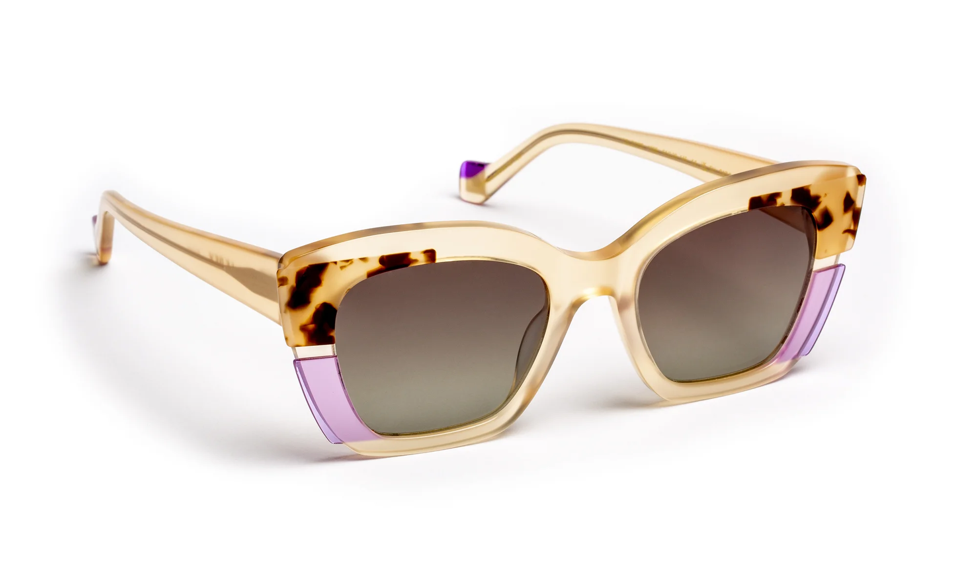 Monture solaire en acétate au design sophistiqué, sublimée par une finition facettée entièrement travaillée à la main. Ses larges branches, délicatement creusées, captent la lumière et révèlent des reflets subtils pour une allure contemporaine et affirmée. La palette de coloris en dégradé translucide joue sur la transparence et la profondeur, créant des effets de lumière changeants qui illuminent la face.