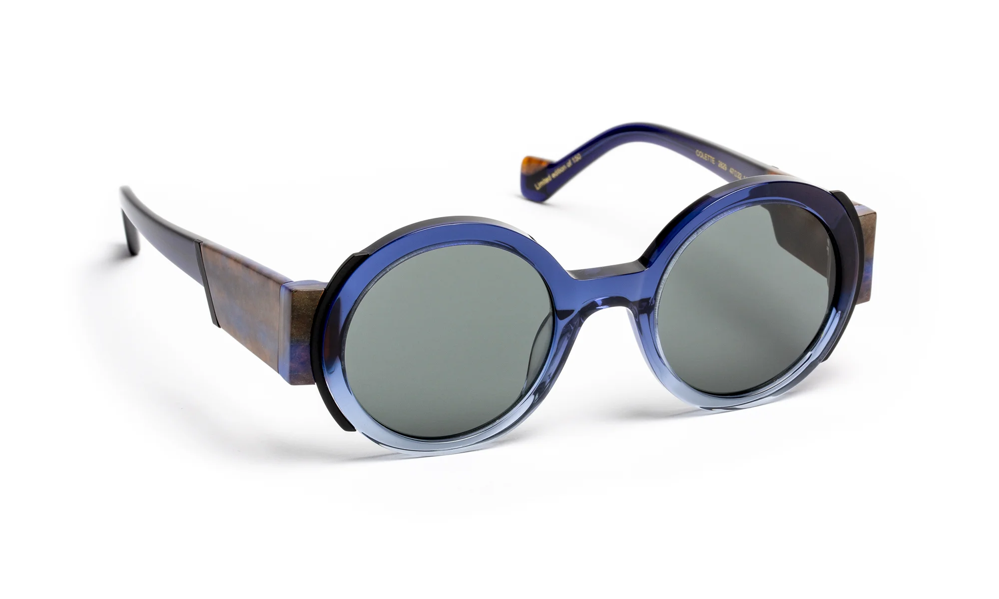 Monture solaire en acétate au design sophistiqué, sublimée par une finition facettée entièrement travaillée à la main. Ses larges branches, délicatement creusées, captent la lumière et révèlent des reflets subtils pour une allure contemporaine et affirmée. La palette de coloris en dégradé translucide joue sur la transparence et la profondeur, créant des effets de lumière changeants qui illuminent la face.