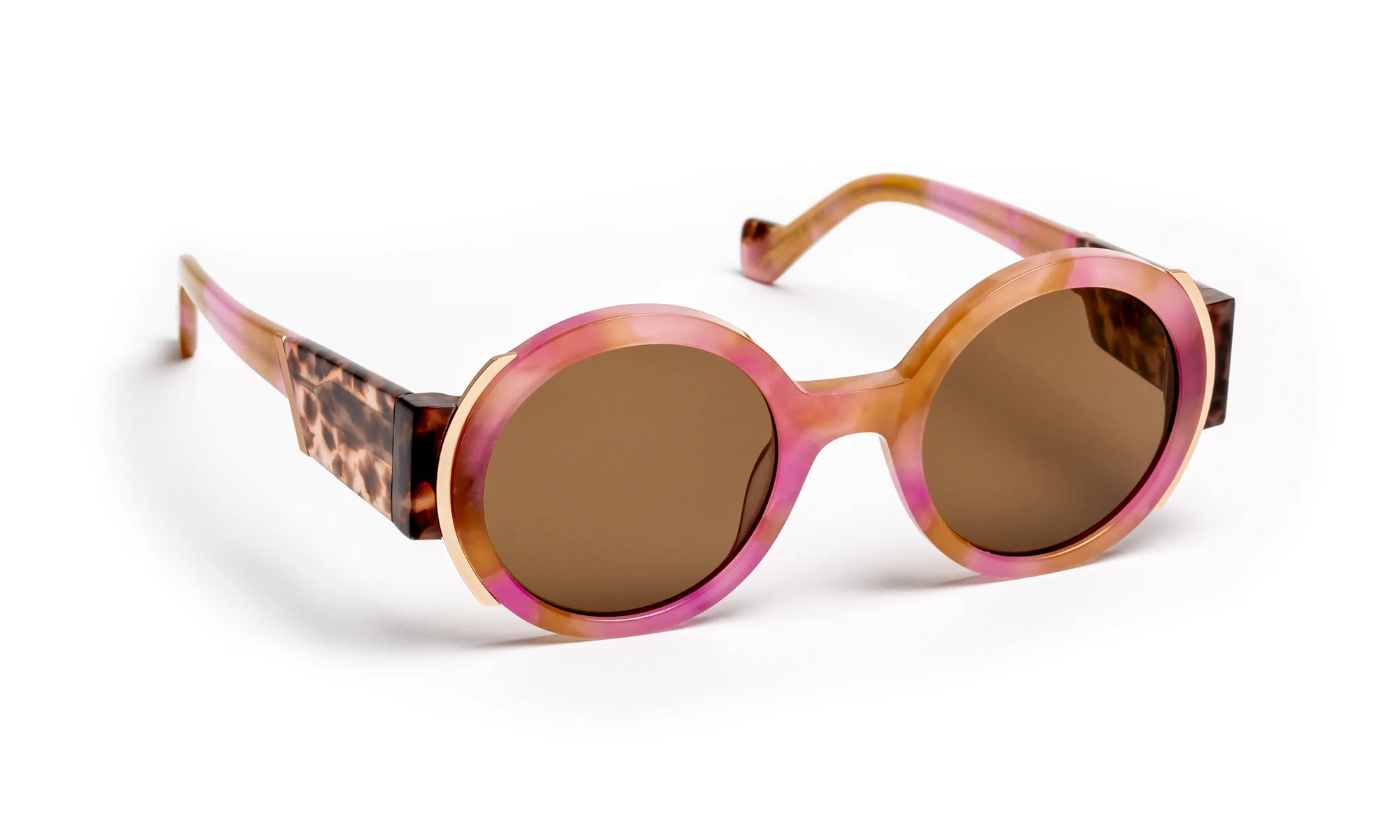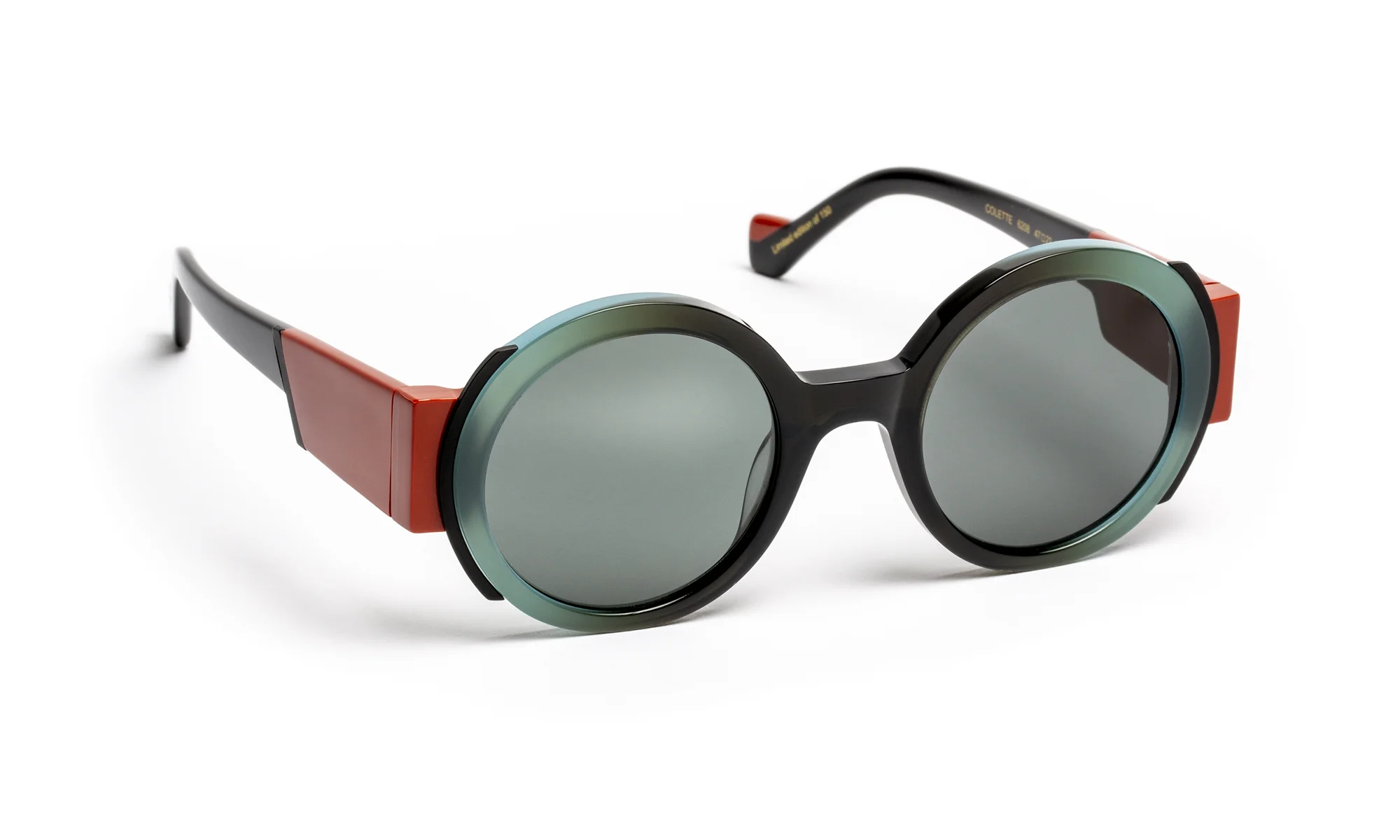 Au design graphique affirmé, ce modèle joue avec la couleur et la lumière à travers une architecture multicouche. La face en acétate, soulignée d’une lamination contrastée et d’un insert métallique, capte les reflets et prolonge son éclat jusque sur la branche.