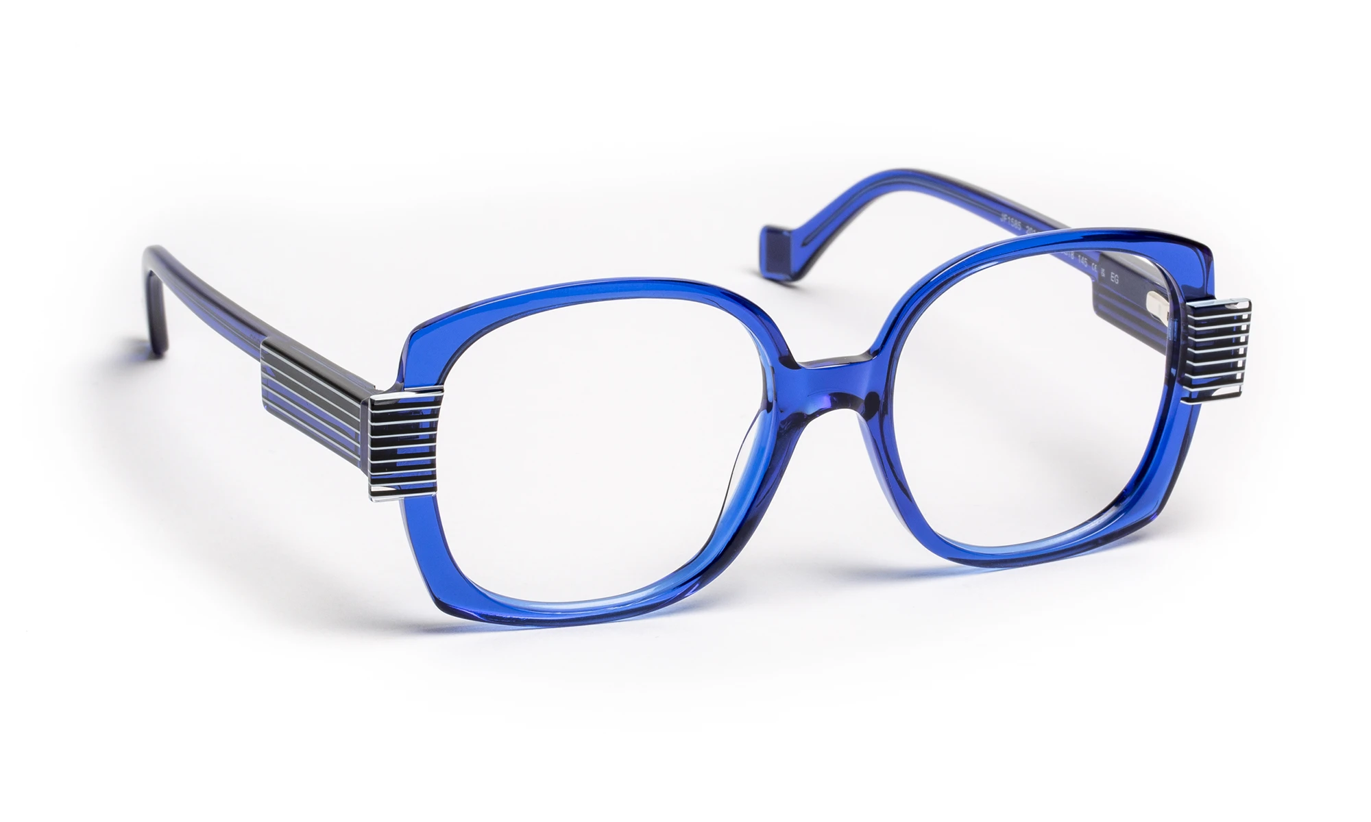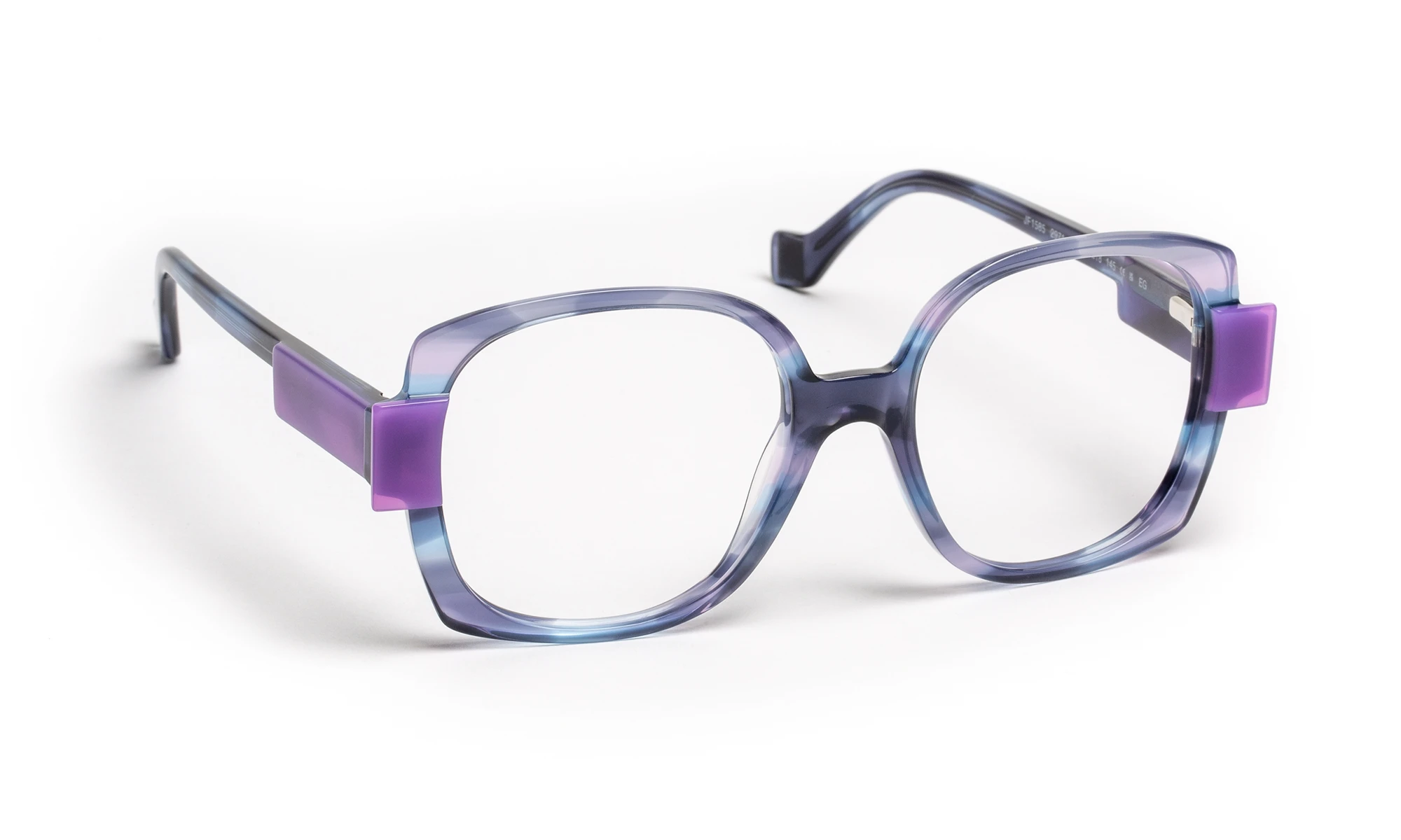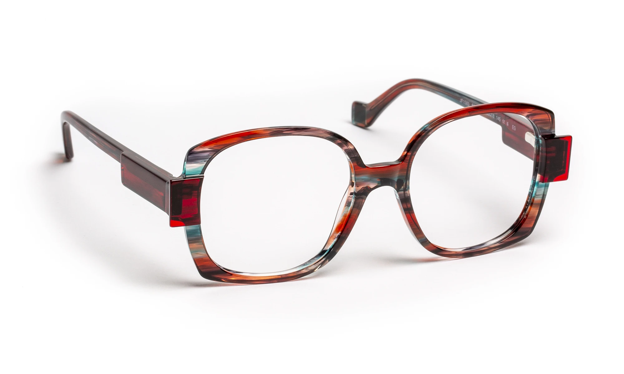 Acetate face and temples, large shape with rounded curves and marked angles. The temples are adorned with multicolored details, adding a unique, artistic touch. The high-gloss finish accentuates the brilliance of the color and highlights the modern, refined lines of the ensemble.