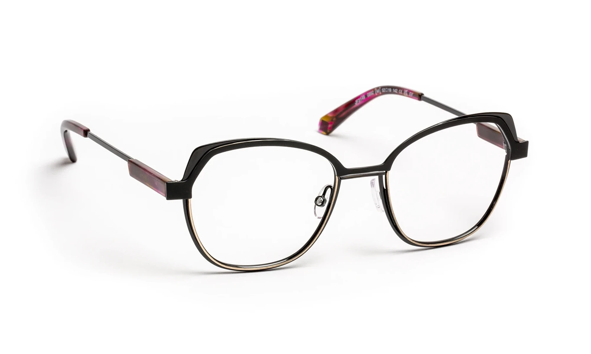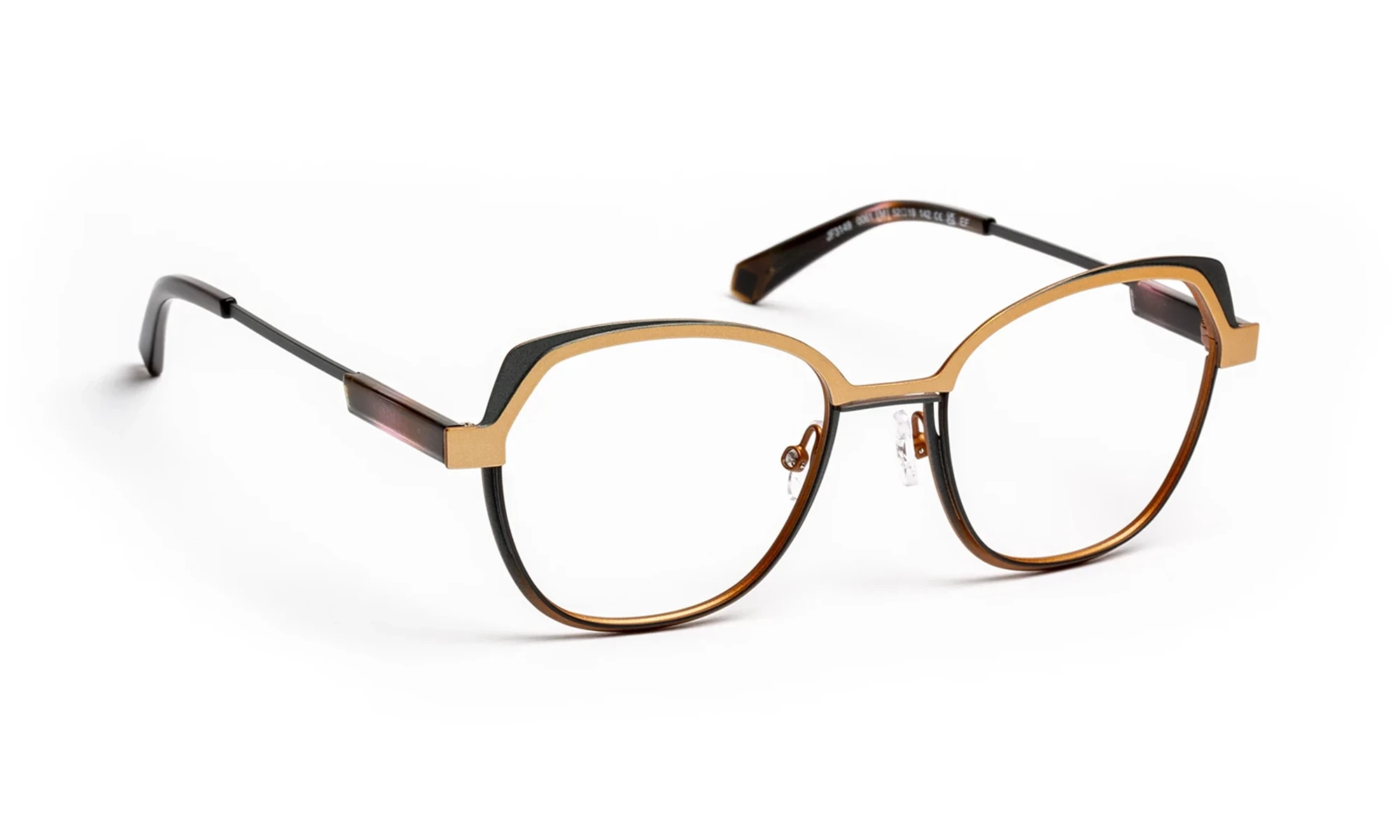 The frame combines refined, lightweight metal with graphic lines and subtle reliefs. Three harmonious colors enhance the front, while the thin temples feature an acetate detail that adds an elegant signature. The result is a modern, lightweight, and sophisticated style where materials and tones echo one another with precision.